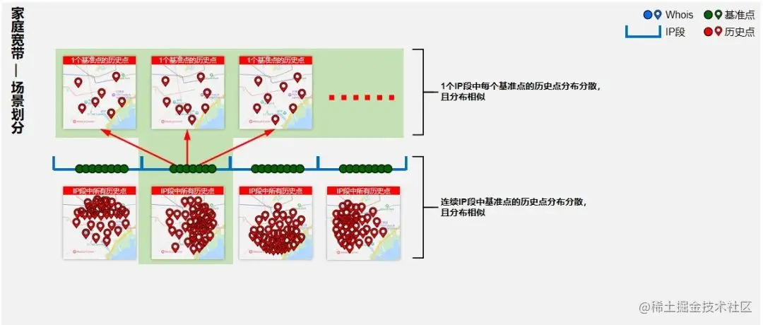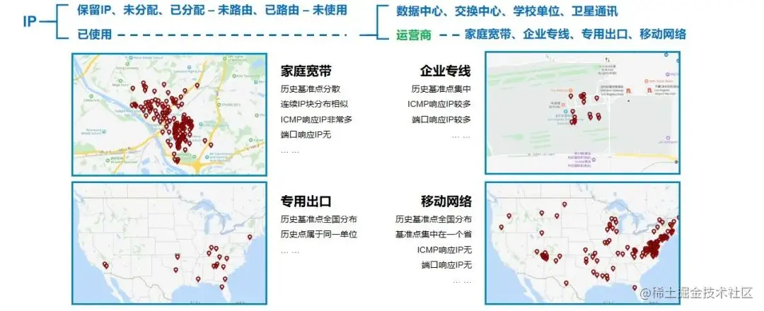 例如,对企业专线场景IP,收集挖掘一定时间内的IP位置信息;对家庭宽带场景IP,挖掘出多种数据来源提供的IP位置信息。针对不同场景IP基准点的分布特性和网络探测响应情况等,对基准点进行相应的动态聚类分析,排除异常基准点,通过IP定位算法得到最优定位结果。