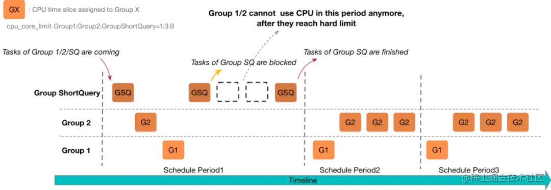 当有短查询资源组的任务时,其余的资源组在每个周期只能使用 hard limit 的资源。如果在一个周期内它们使用的资源超过了该阈值上限,则本周期不会再调度它们的任务去执行。