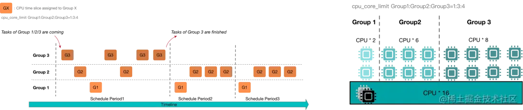 以下图为例,三个资源组会按照1:3:4的比例来使用所有16核的 CPU 资源,即从逻辑上会分别分配到2核、6核和8核的 CPU ,并且当资源空闲时,正在运行的资源组可以弹性使用更多的资源。当第一个调度周期结束以后,第三个资源组的所有任务都已经完成了,所以在接下来的调度周期2和3中,其他的资源组1和2就可以使用全部的 CPU 资源了,也就是每个周期可以分配到更多的时间片。