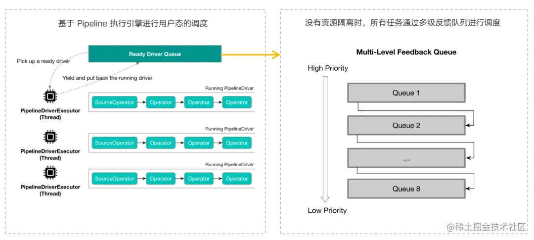 pipeline 执行引擎会将所有查询的执行单元任务在用户态进行调度,因此可以很方便地实行各种不同的调度策略。而当没有资源隔离时,所有任务是通过多级反馈队列进行调度的。