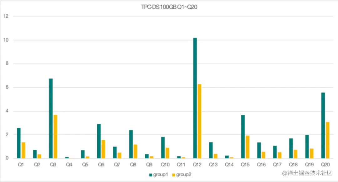 下面图中是 SSB 100GB 的测试结果,可以看到每一个查询的 QPS 都符合了2:1的比例。