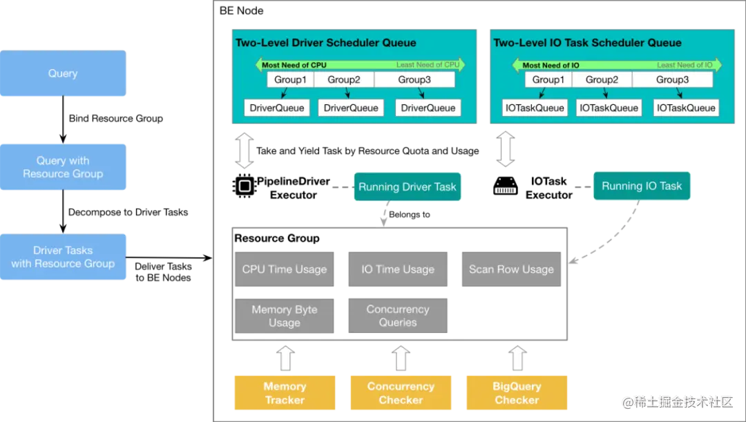 对于 CPU 和 IO 资源的软隔离是基于 StarRocks 的 pipeline 执行引擎实现的:pipeline 执行引擎会将所有查询的执行单元的任务在用户态进行调度。