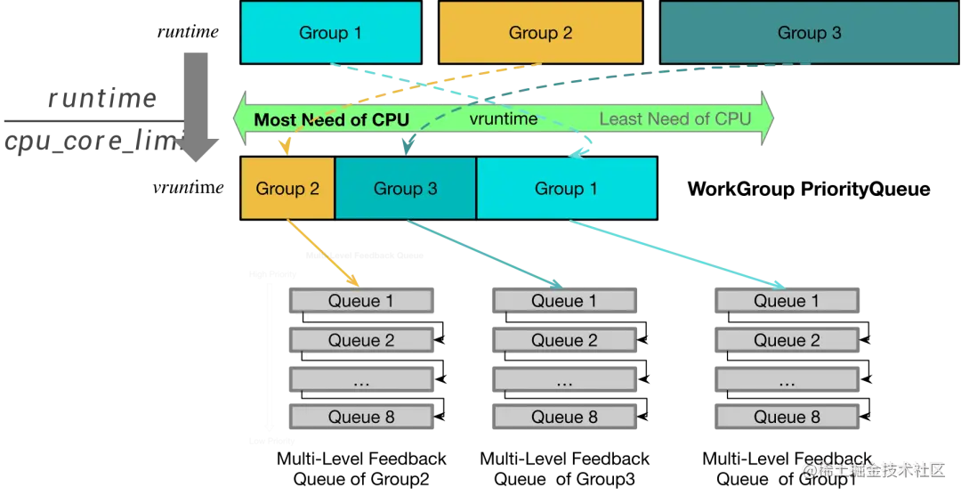 此外,如果一个很久没有任务的资源组再次有任务到来时,因为其他的资源组一直在运行,它们的 Vruntime 在持续增加,所以这个资源组的 Vruntime 会相对小很多。为了避免一直调度它的任务去执行,导致其他资源组饥饿,所以会调整它的 Vruntime 为当前最小的资源组的 Vruntime ,并且减去一个常量作为它的奖励。