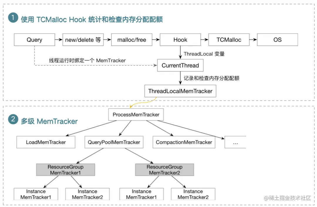 对于内存资源的硬限制,复用了 StarRocks 已经提供的对于内存资源统计和检查的功能,使用 TCmalloc 的 Hook 在申请和释放内存时对内存进行统计和检查,在每一个线程运行时会绑定一个 Memory Tracker 到一个 Thread Local 变量。这个 Memory Tracker 就是用来记录和检查内存的,它是一个多级的树结构。其中对于资源隔离来说,会添加每一个资源组的 Memory Track 到树形结构中。
