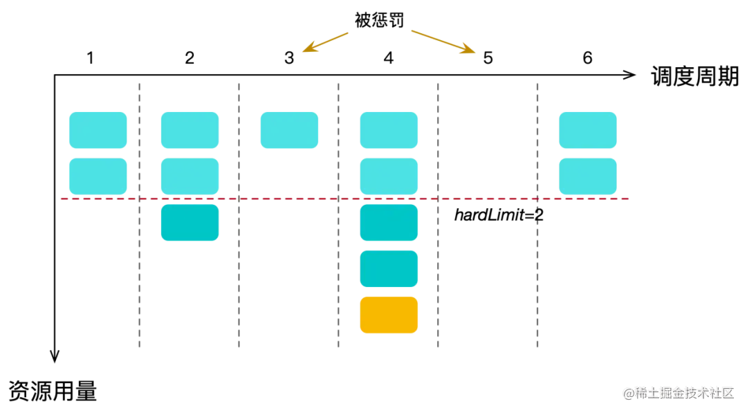 但是在同一时刻可能会有多个这些资源组的任务在执行,所以当发现资源超限时,它们的资源用量可能已经超过很多了。因此,我们添加了惩罚策略来保证在总体上,对于这些资源组的硬隔离:如果在本周期,它们的资源用量在一倍 hard limit 到两倍 hard limit 之间,那么会将它的下一个周期的资源用量初始值赋值为当前用量减去 hard limit ,也就是在下个周期可以使用少量的资源。而如果当前用量在两倍 hard limit 以上,那么会将它下个周期的资源用量初始值赋值为 hard limit ,即下个周期无法调度它们的任务去执行。