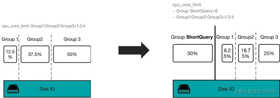 另一方面,当有短查询资源组的查询时,也会为其预留cpu_core_limit 的 IO 资源。