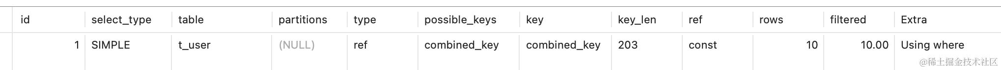 EXPLAIN SELECT * FROM `t_user` WHERE user_name = 'Shannon Henry' AND age = 20;根据最左索引匹配规则,使用组合索引时必须严格按照组合索引中字段的顺序来使用,这么使用会导致存储引擎层只能使用 user_name 这个条件做筛选