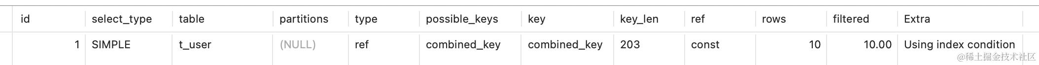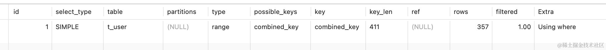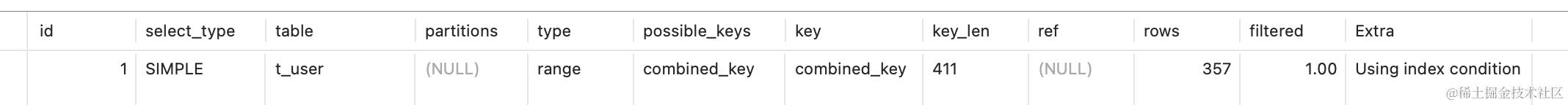 EXPLAIN SELECT * FROM `t_user` WHERE user_name like 'Shannon%' AND full_name = 'xiao ming' And age = 20;因为索引匹配规则是从左到右匹配,当使用 user_name 进行模糊查询时会导致即使正确使用组合索引,存储引擎最终也只能用上其中的 user_name 这一个字段来做筛选,后面两个字段需要交给 Server 层自行筛选