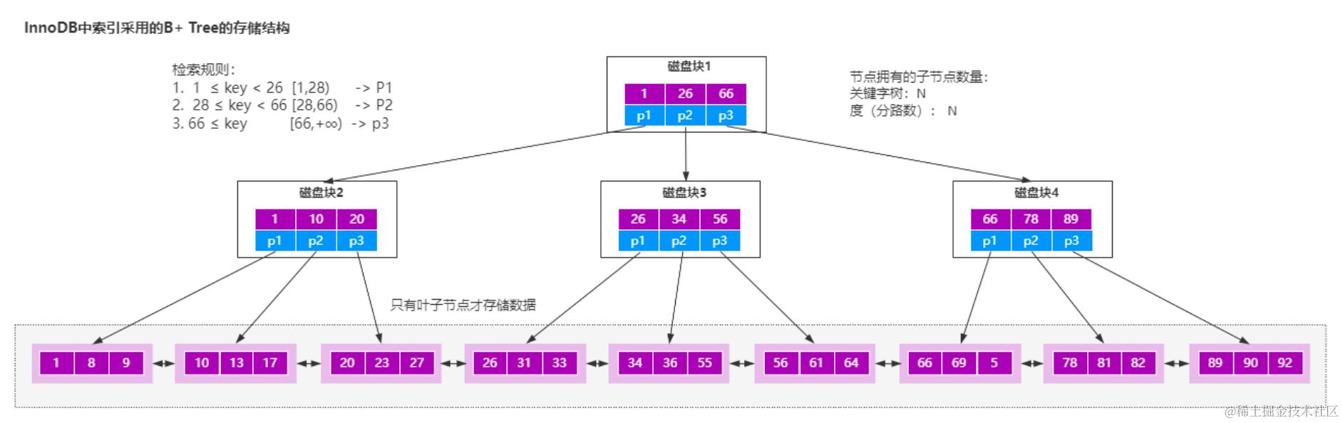 - 搜索规则:B Tree 的子树区间时不包含关键字的,B+ Tree 是左闭右开区间。是因为 B+ Tree 中的非叶子结点不存储数据,数据都在叶子结点中
