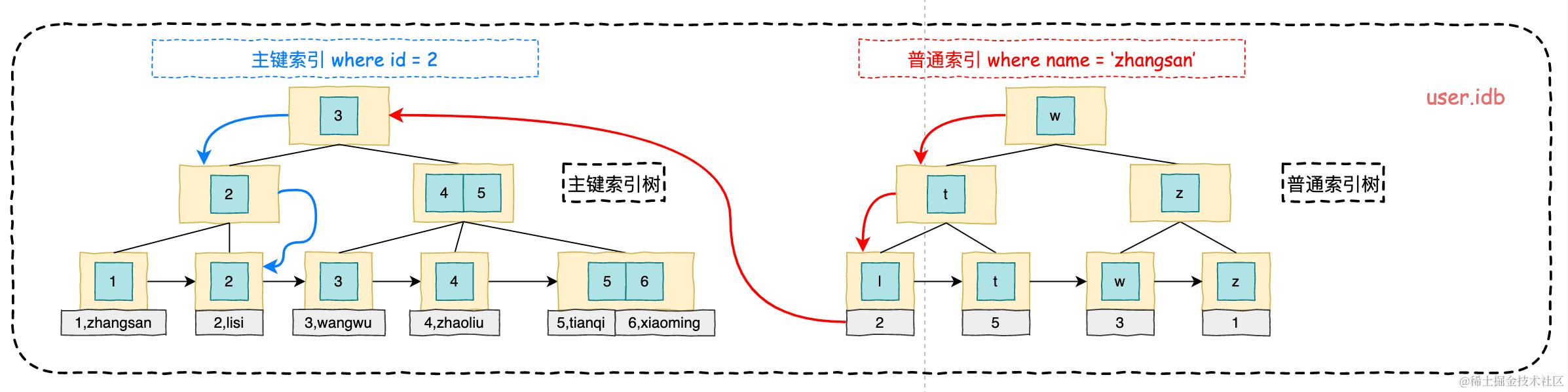 - 条件满足,使用索引中的主键值去主键索引树上定位并读取完整的数据行