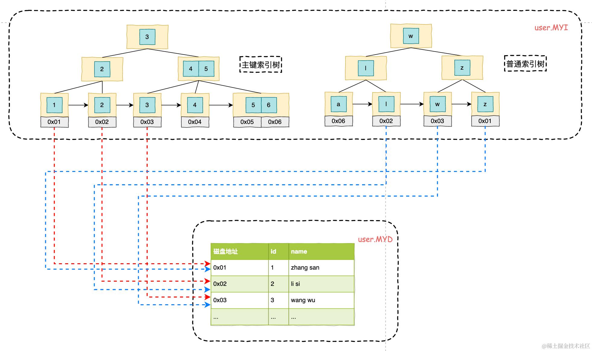 一个索引对应一棵 B+ Tree,所有的 B+ Tree 都存储在 MYI 文件这里,在 MYI 文件中找到索引值对应数据的磁盘地址后再从 MYD 文件中找到完整的数据