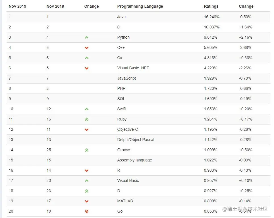 让我们看一下最新的编程语言的热度吧,截图自 www.tiobe.com/tiobe-index…