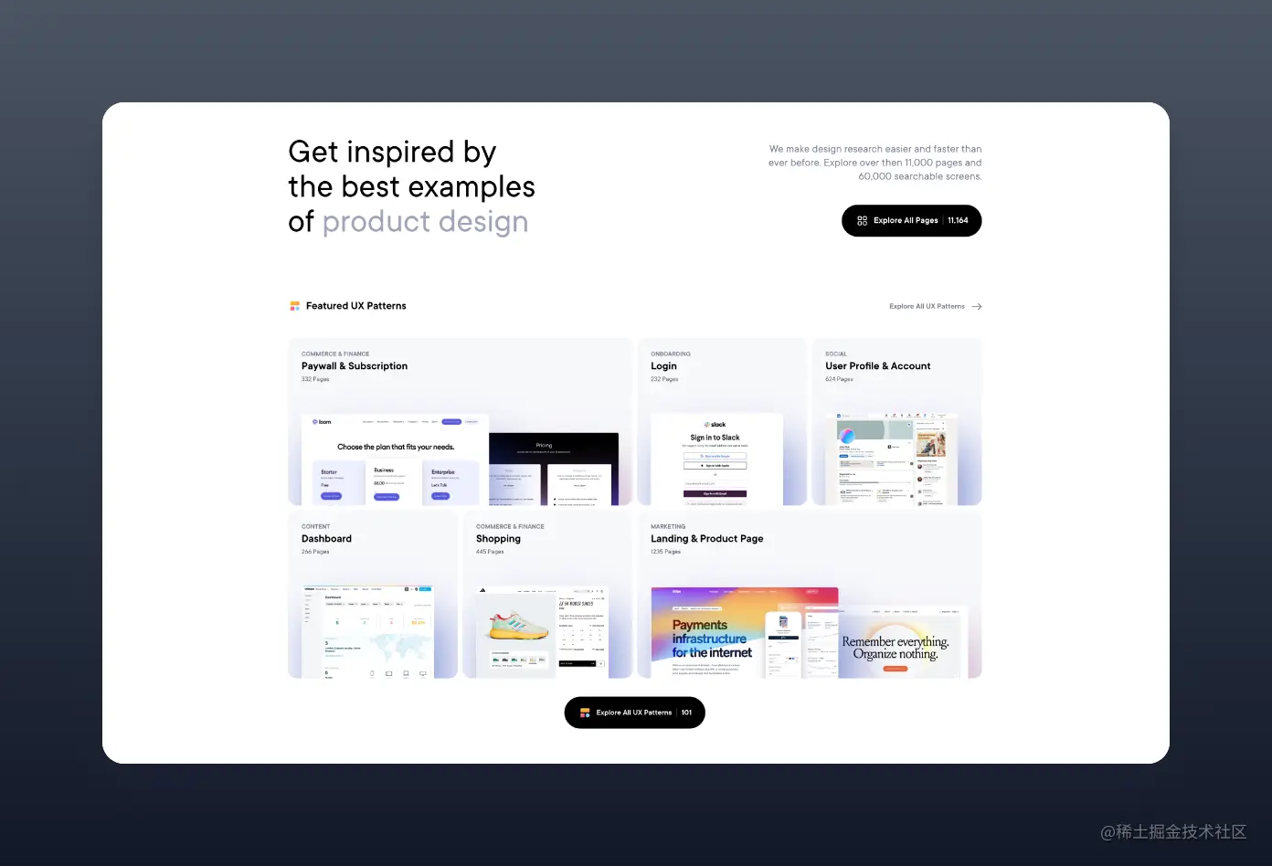 这是一个网站设计的灵感库,超过 9k 个页面截图,这类产品现在很多的了,感觉网页内容比较多的是 nicelydone.club,手机端依旧是 Mobbin 最全的了。
