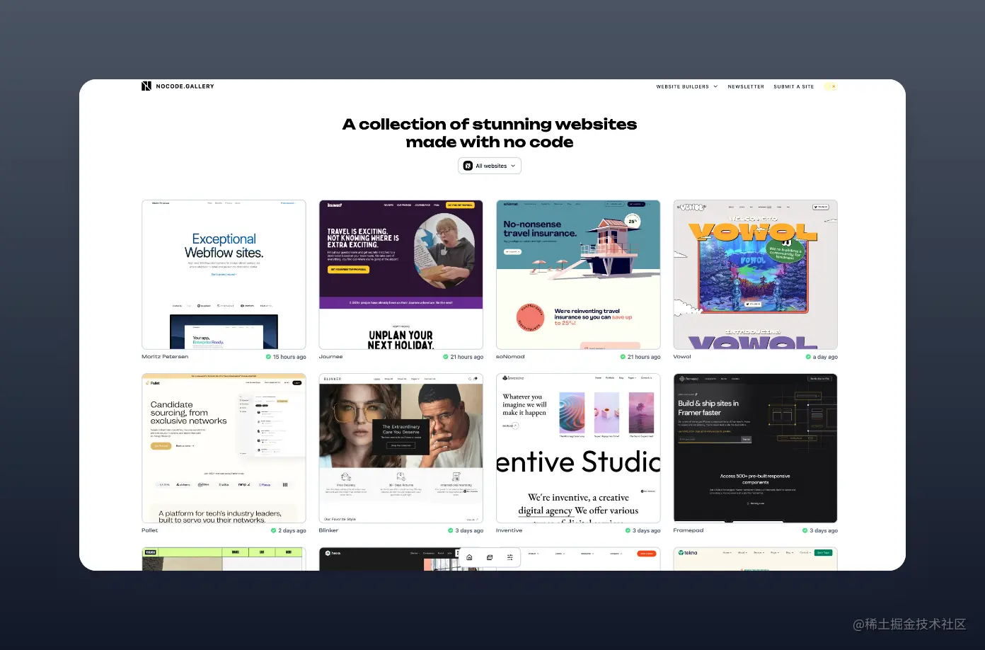 这个网站收集了很多用无代码工具制作的精美网站。 包括 Framer 、Webflow 和其他 nocode 工具制作的网站,可以按平台进行过滤。