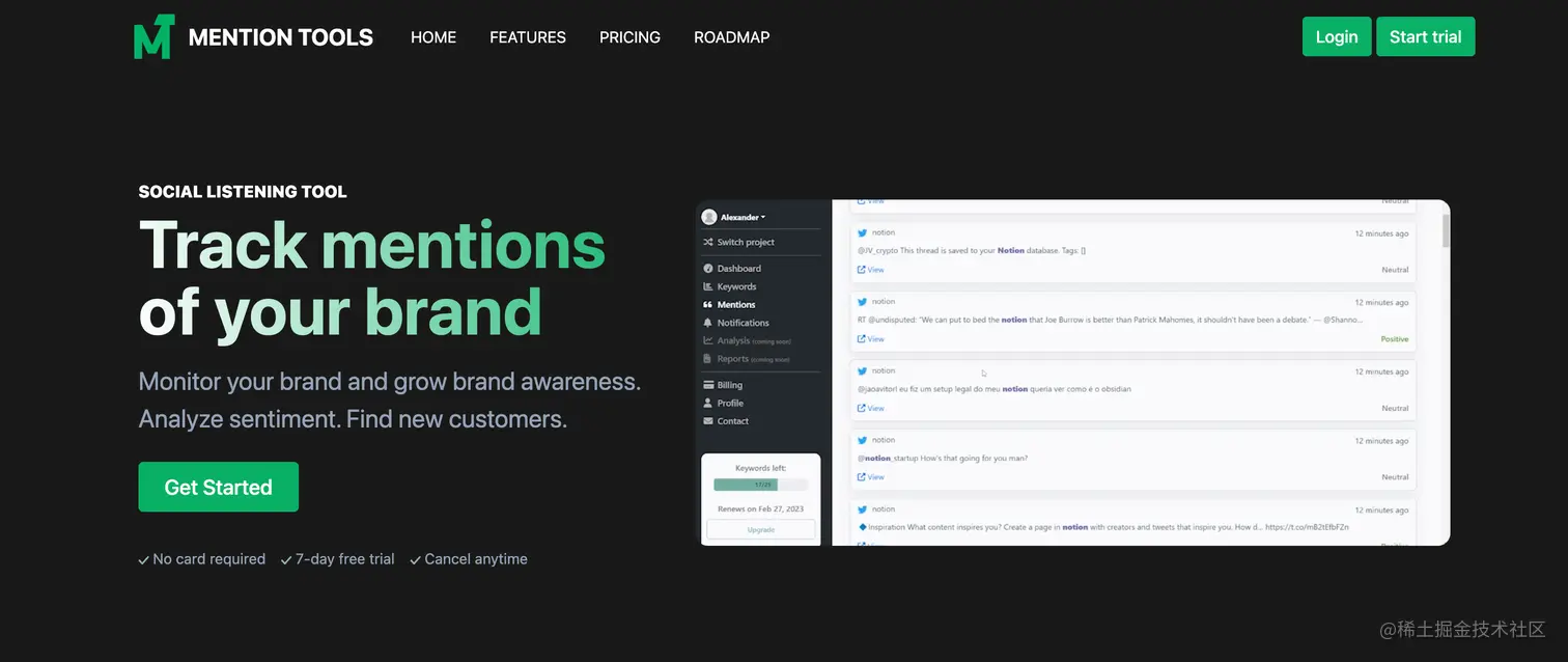 这是一个社交网络舆论监控工具,用来跟踪 Reddit、Twitter、Facebook、Qoura 和其他社交网络上的内容,用来监控某个品牌,分析市场反应,提高品牌知名度。也挺适合独立开发者来做的一个项目。