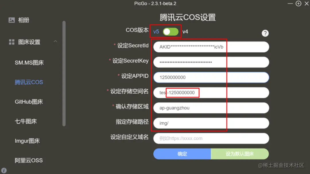 ****安裝 PicGo,在图床设置里找到腾讯云 COS,如下图实例配置好参数,并设置为默认图床: