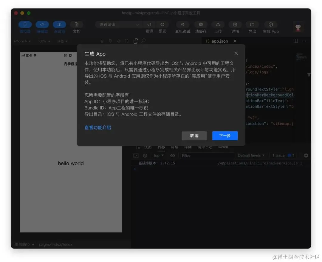 FinClip 还自研了一个 小程序 IDE 开发工具,界面与微信小程序的开发工具类似,自带调试和真机预览,简单易上手。