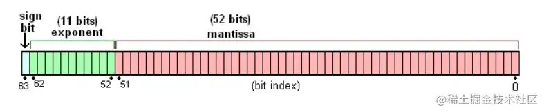 64 位双精度使用 64 位二进制表示浮点数,用 11 位存储二进制科学计数法的指数部分,用 52 位存储有效数字部分