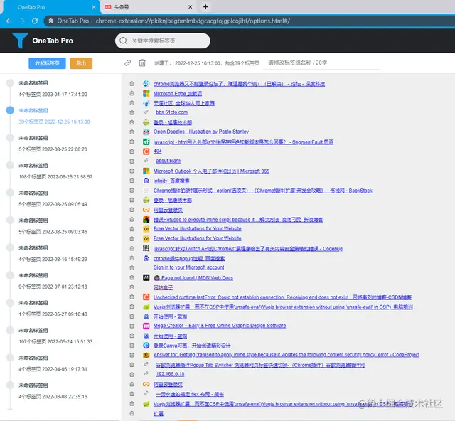 在数据的管理方面,pro版本更加符合我们国人的使用习惯,分左右栏,左边就是我们收起的标签组列表,右边则是当前选中标签组下的所有标签页,可以单独删除标签页或者将标签组给删除掉,