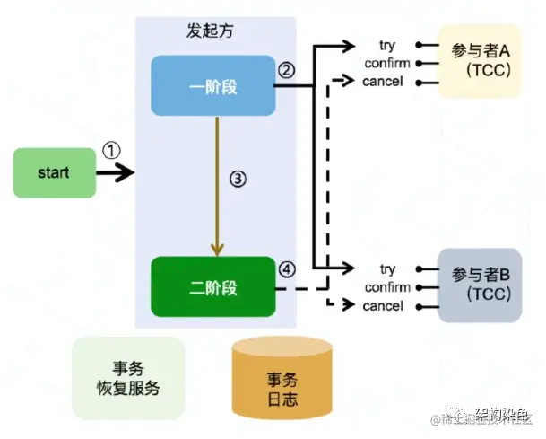 - TCC 模式要求由业务侧通过编码实现 Try、Confirm、Cancel 3 个方法,TCC 的 Try 操作作为一阶段,负责资源的检查和预留;Confirm 操作作为二阶段提交操作,执行真正的业务;Cancel 操作作为二阶段回滚操作,执行预留资源的取消,使资源回到初始状态。
