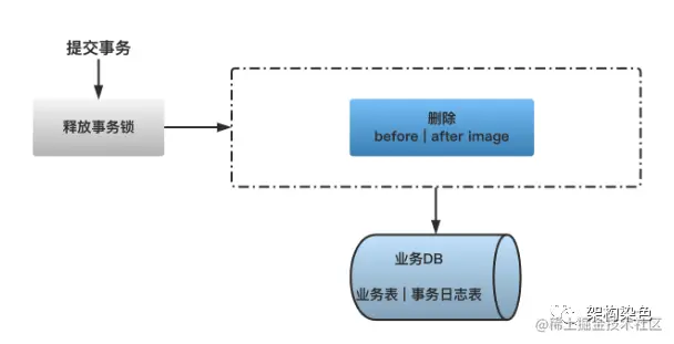 二阶段如果是提交的话,因为“业务 SQL”在一阶段已经提交至数据库, 所以 Seata 框架只需立即将一阶段的事务行锁释放后(尽早释放锁以提升性能),再将对应”before | after image“数据的清理即可(因为本地事务和全局锁都已释放,此环节可采用更高性能的异步处理)。