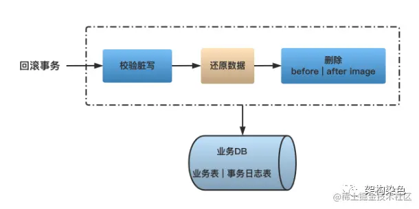 二阶段如果是回滚的话,Seata 就需要回滚一阶段已经执行的“业务 SQL”,还原业务数据。回滚方式便是用“before image”还原业务数据;但在还原前要首先要校验脏写,对比“数据库当前业务数据”和 “after image”,如果两份数据完全一致就说明没有脏写,可以还原业务数据,如果不一致就说明有脏写,出现脏写就需要转人工处理。