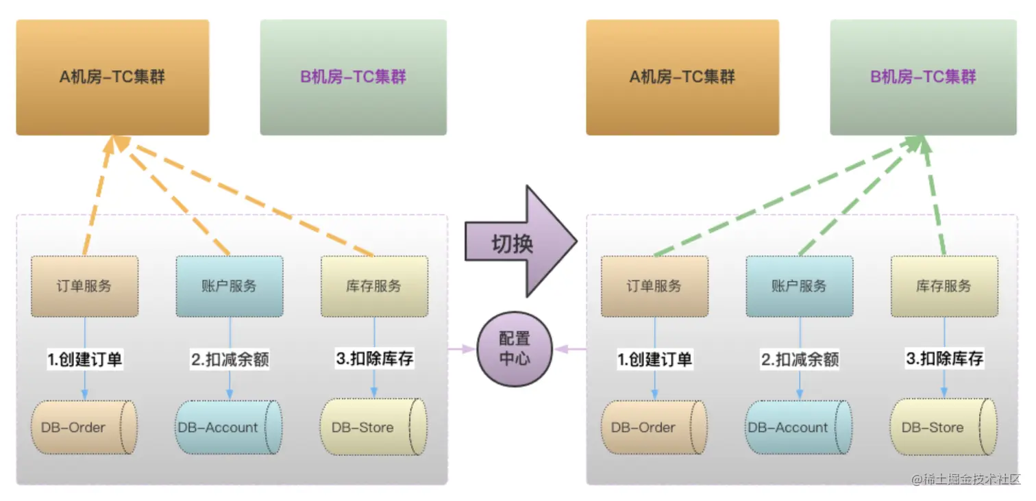 应用到集群是这样一个间接的关系:应用 -》事务分组 -》TC 集群,应用启动后所指定的事务分组不能变,可通过配置中心变更事务分组所属的 TC 集群,Seata 客户端监听到这个变更后,会切换到新的 TC 集群。