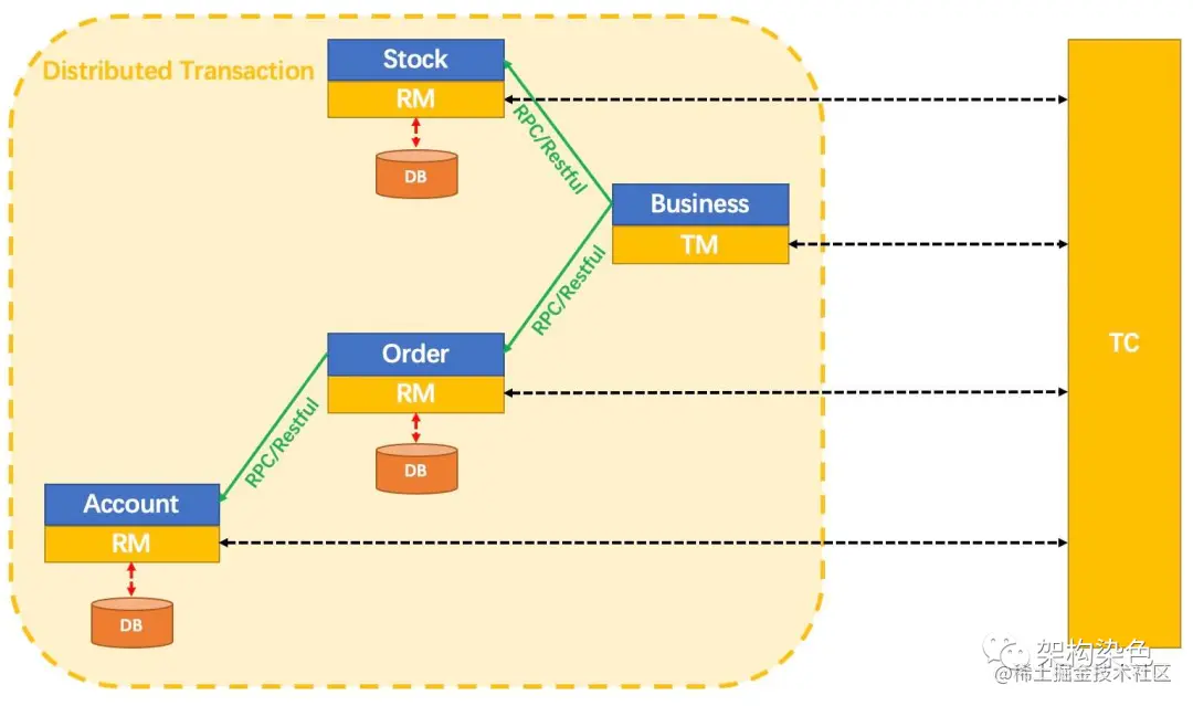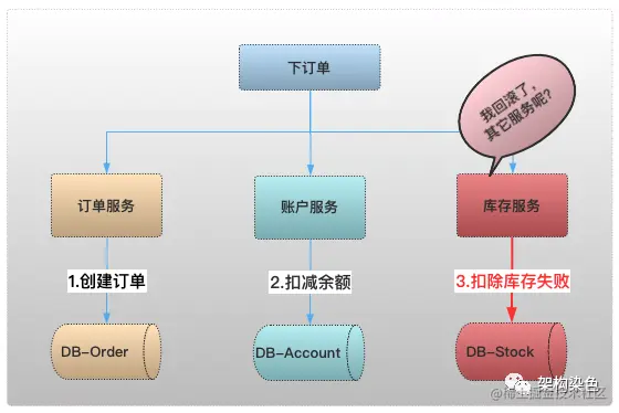 本地事务只能保证每个服务各自的本地事务,比如库存服务 DB 操作异常,其通过本地事务回滚后库存数据无异常,但订单和账户的记录并未回滚,因为他们并不知道库存异常了,这便是典型的分布式数据一致性问题。