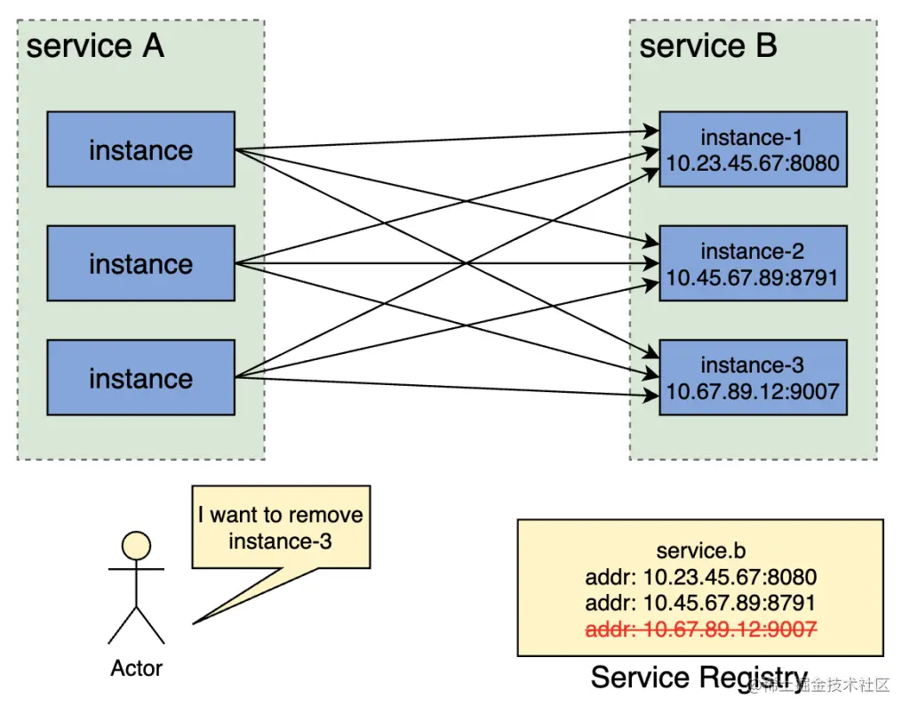 若管理员发现服务B的实例3有问题,需要下线,如何实现