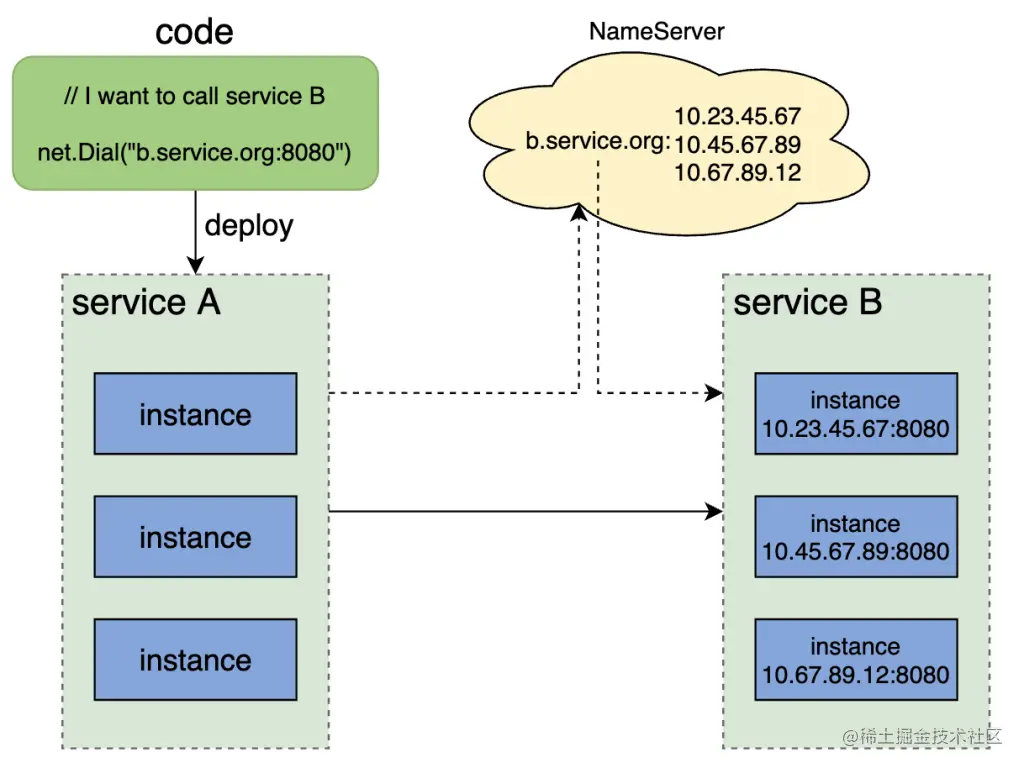 如图所示,服务A通过域名调用服务B,服务B的三个IP地址通过NameService登记到域名当中去,这样当服务B的IP地址发生变化时,只需修改域名记录即可,不会出现只返回一个实例的问题