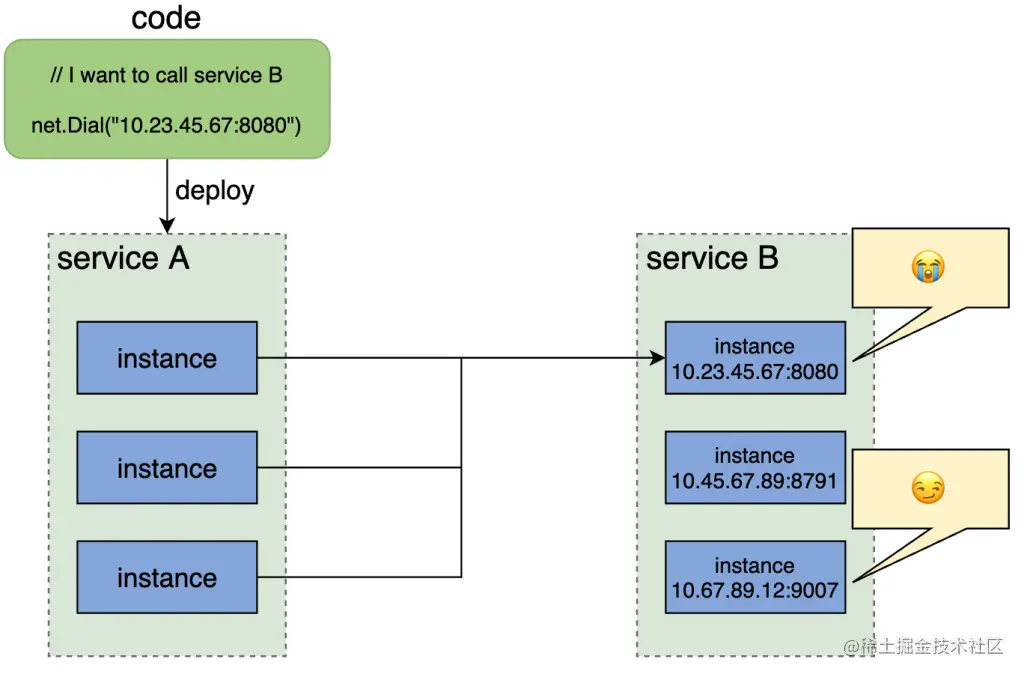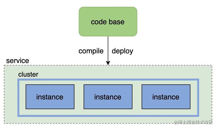 在上图中,一段代码通过编译、部署,生成了一个服务,服务里有一个集群,集群中包含多个实例