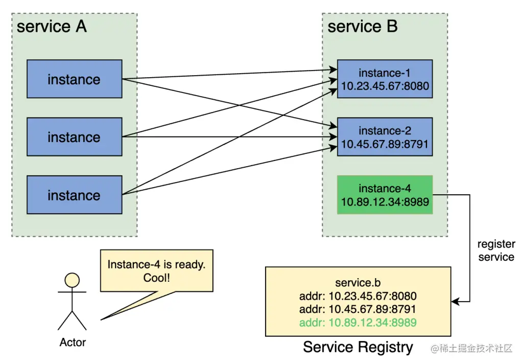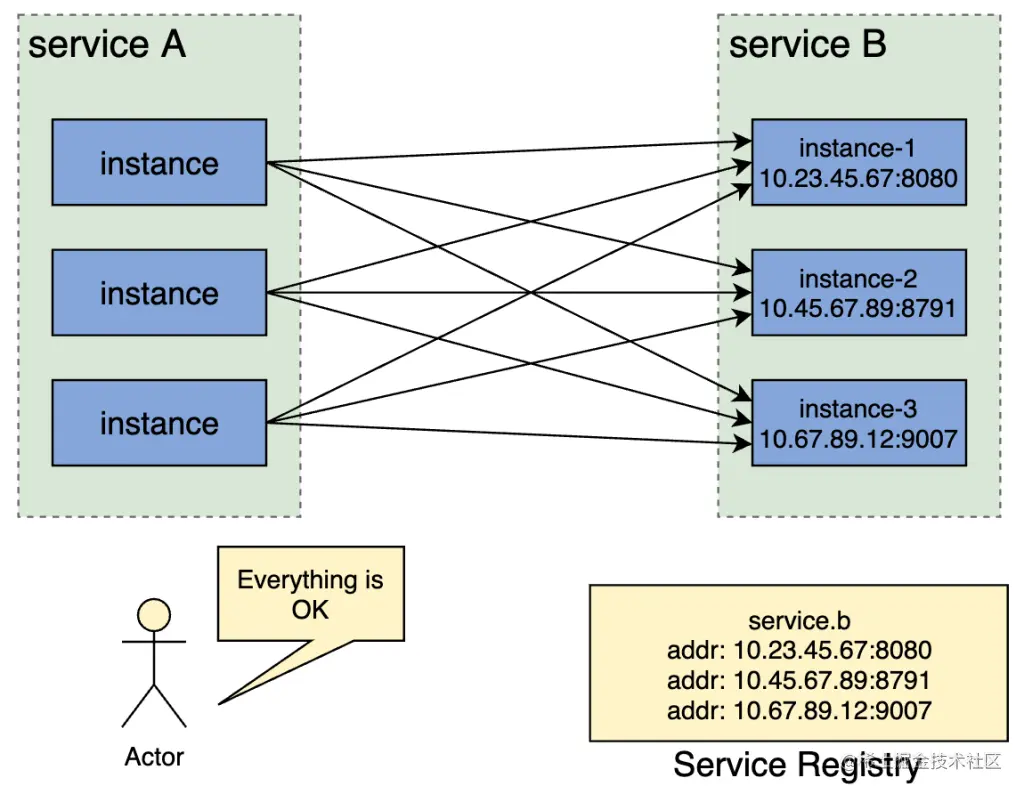 在上图中,一个服务包含若干个实例,服务与服务之间通过网络传输进行通信