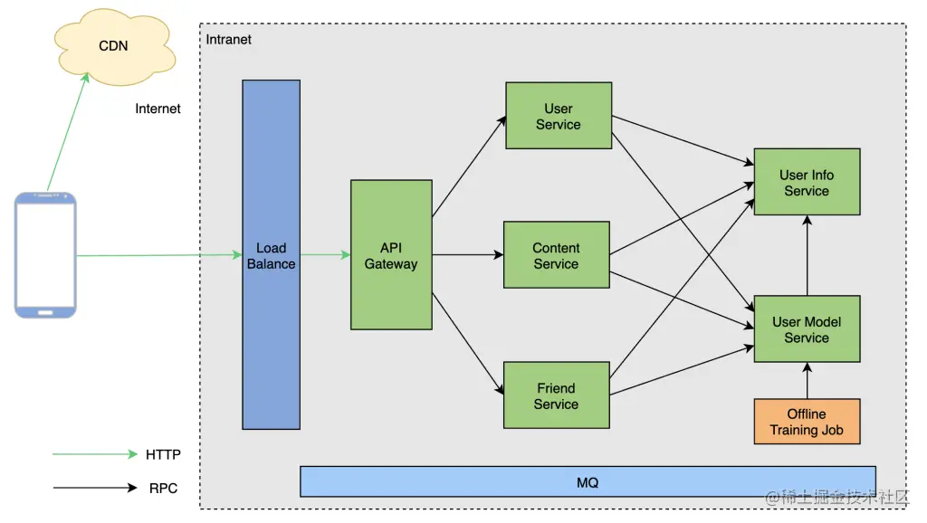流量进入右侧Internet企业内网环境之后,首先会经过负载均衡(Load Balance),API网关,最后在分配到各个服务上去