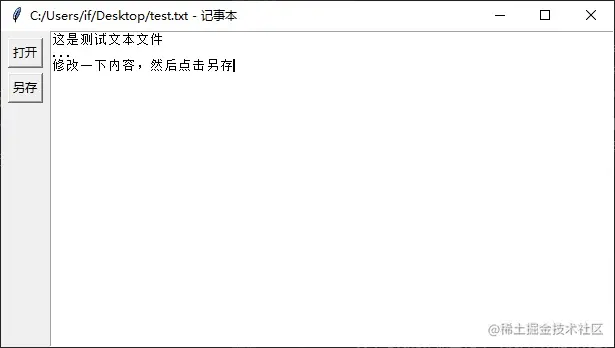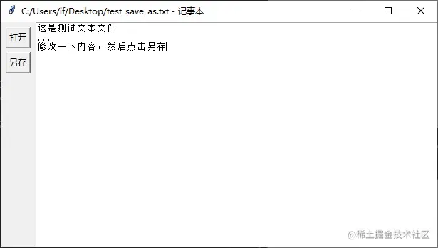 上面代码的修改点是添加了一个响应函数 save_as_file,这个函数用于选择另存文件位置并把编辑框内容写入指定位置文件,然后在实例化按钮控件 btn_save_as 时,把响应函数 save_as_file 赋值给参数 command 即可。