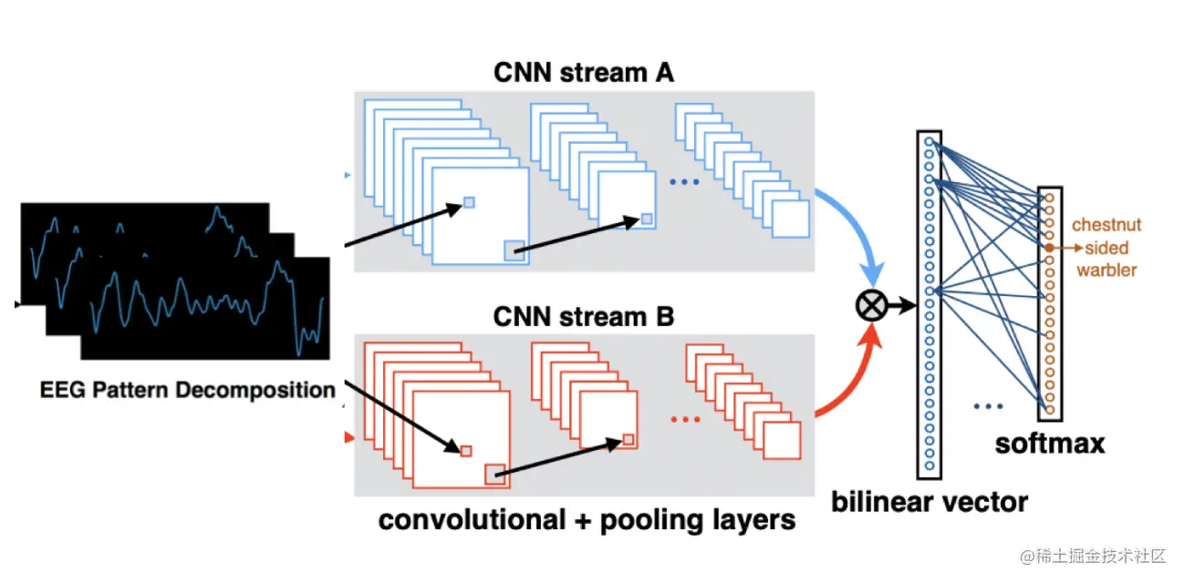 如上图所示,本项目提出了一种双分支网络,首先將图像信号进行离散小波变换,将图像信号拆解为两个函数,分别入对应的网络通路,网络整体设计思想参考了双线性卷积神经网络的结构。