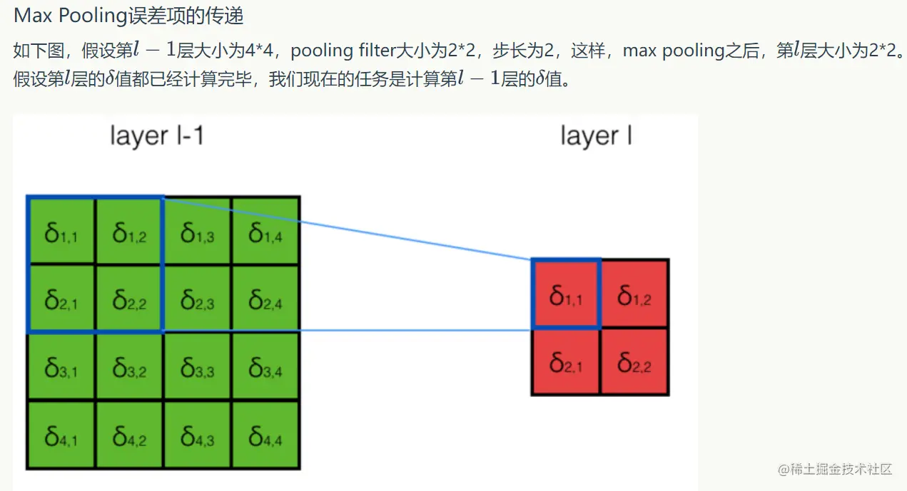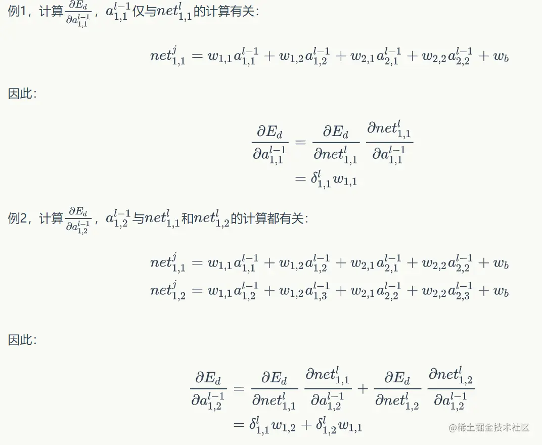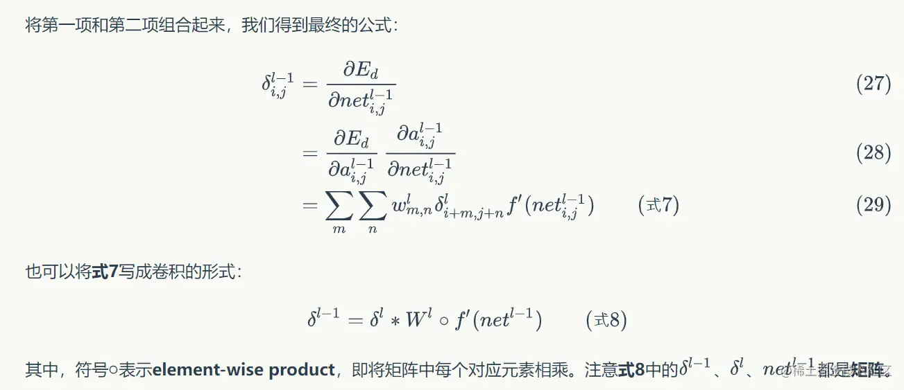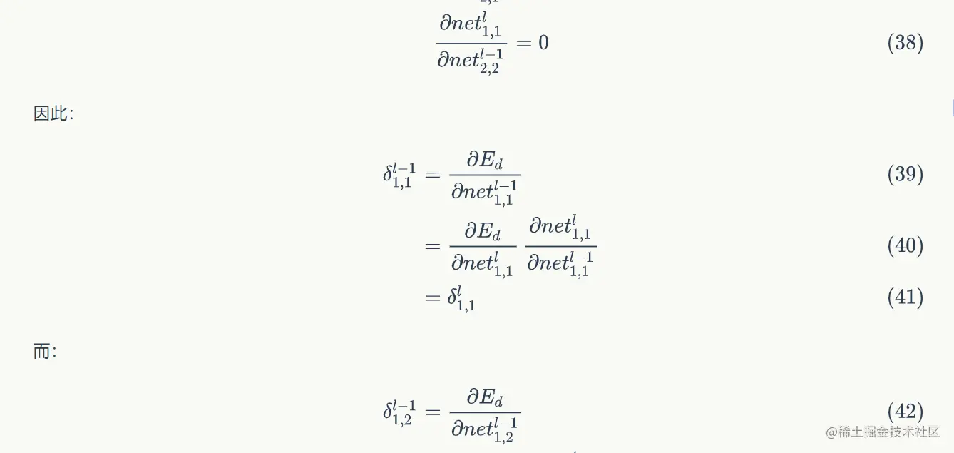 - 在这里,我们假设第中的每个δ值都已经算好,我们要做的是用链式求导法则计算第层l-1层每个神经元的误差项。