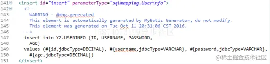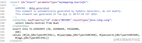 配置文件generatorConfig.xml准备结束后重新进行逆向操作,在sqlmapping包中生成最新版正确的.java和xml文件,最新版的insert语句如图1-19所示。