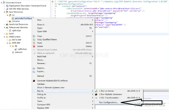 新建名为GeneratorOracle的Web项目,然后在Java项目的src结点下单击鼠标右键新建1个MyBatis的Generator配置文件,如图1-8所示。