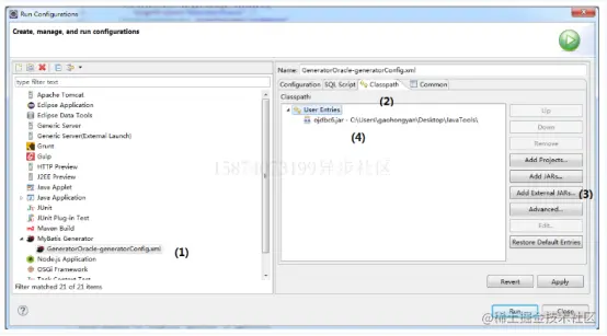 弹出配置界面如图1-14所示,按(1)、(2)、(3)、(4)的步骤将ojdbc6.jar添加到classpath中。