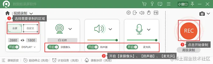 **步骤2:**在视频录制中,选择录制区域,然后根据其他要求设置摄像头、扬声器、排除窗口、麦克风等部件,最后单击【REC】开始录制。