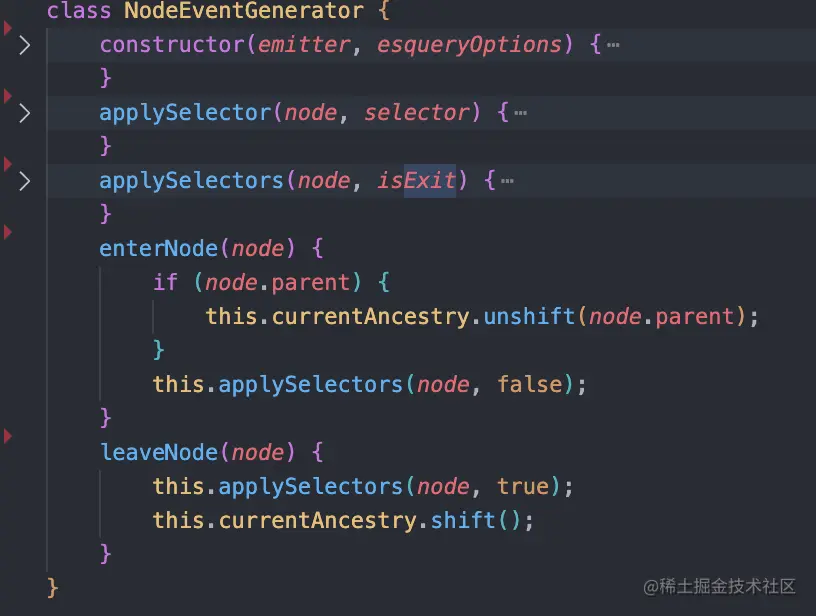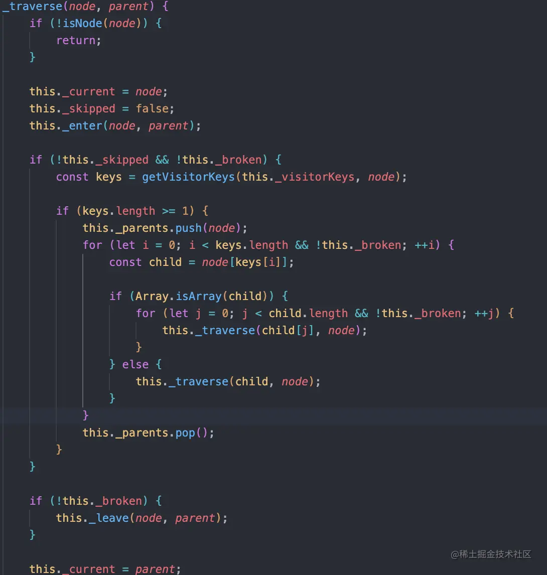 接下来,就是对我们的 nodeQueue 遍历了,通过我们节点上打上的标,来决定是在执行进入逻辑还是离开逻辑。这里我就不展开讲具体的细节了,其实简单理解就是通过 enter 和 leave 的时候去触发不同的 visitor 的动作。