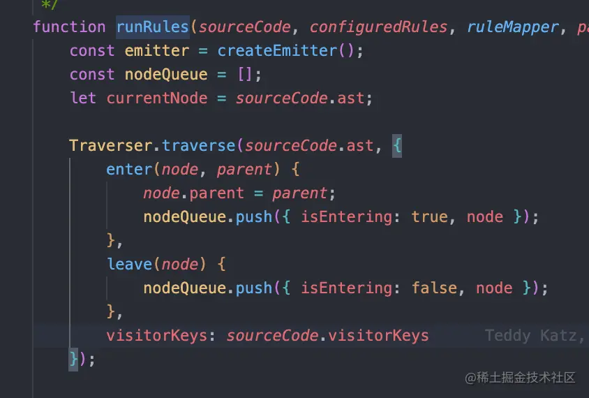 我们在跑规则的时候,肯定需要的是对 AST 进行遍历,同时做一些操作。首先做了一个什么操作呢,调用了一个实例方法Traverser.traverse,传入了ast和一个对象,包含enter、leave和visitorKeys。这个函数的作用就是进行一个递归遍历,同时在遍历的时候通过 enter 和 leave 我们在队列中存储了两个相同的节点,一个是进入时,一个是退出时,方便我们后续处理。这里涉及到一个设计模式,访问者模式(用于数据和操作解耦),通过在遍历时加上 isEntering,可以让我们决定是在进入时还是退出时执行访问者逻辑。