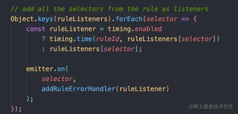 接着我们需要把我们的所有规则都给像上面讲的给创建成 ruleListener,然后在我们的 nodeQueue 后续遍历时,触发某些逻辑。 当然,这里大家可能都想到了订阅发布模式,这个也是在我们整个逻辑中比较重要的一环,遍历时,通过 emit 推送消息,然后让 ruleListener 决定是否需要执行某些逻辑,所以,我们需要对 Listener 订阅上某些事件。