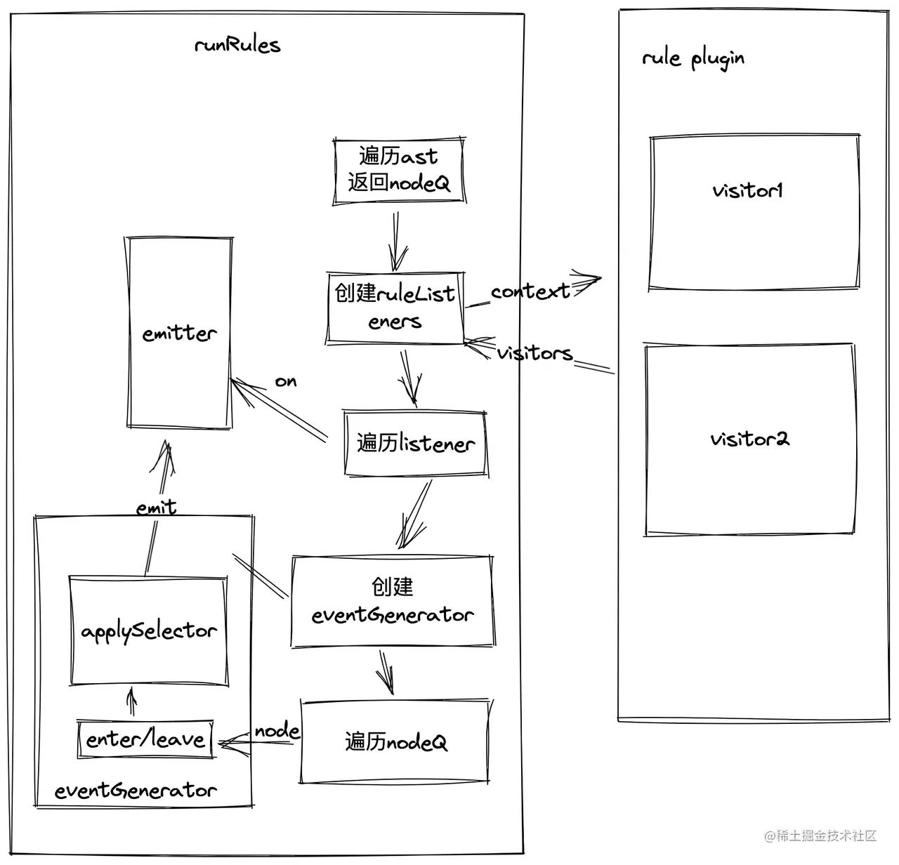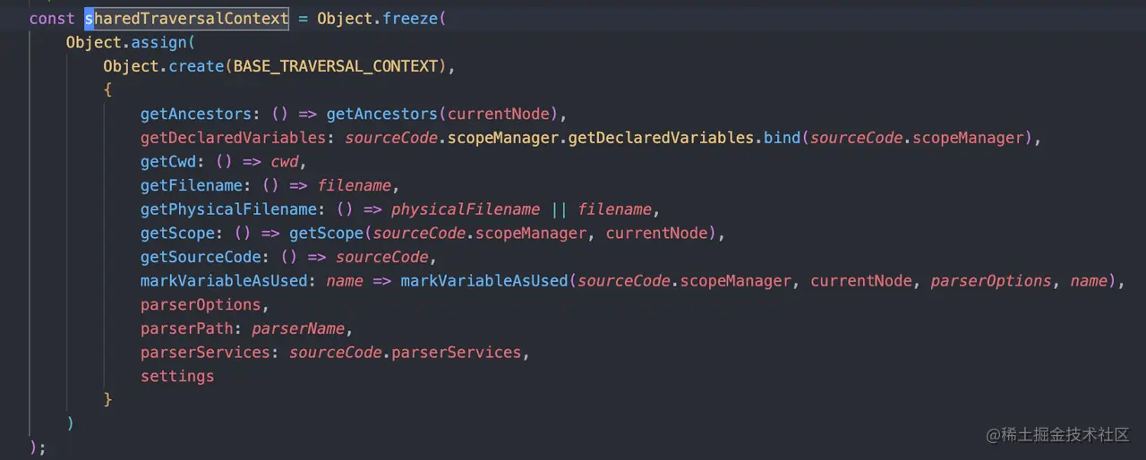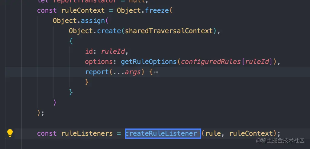 接下来,挨个来讲解这些东西,首先是 context 的上下文形成,这个没有什么好说的,其实就是创建了一个对象,然后提供了一些一些方法,供我们在插件中访问上下文使用,然后对于每个 rule 都在 createRuleListener 中都创建了一个 listener,这里我们在后面串整体流程时还会再过一遍。