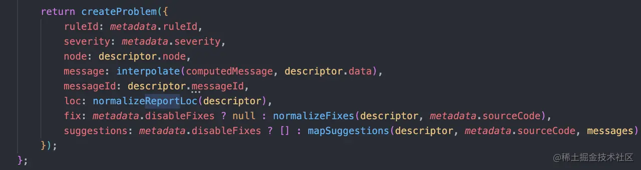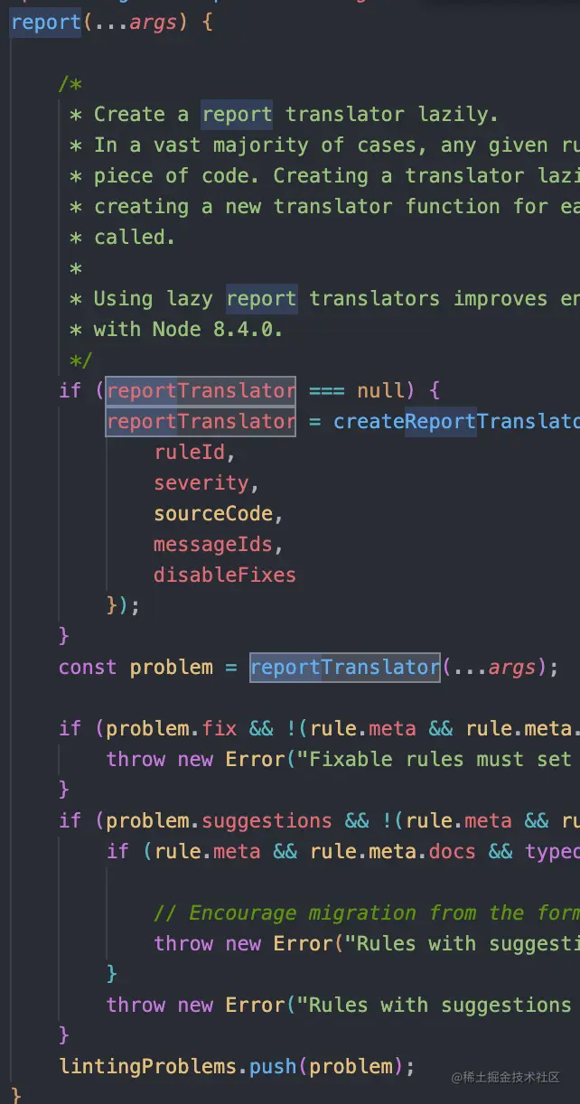 接着是 report 方法,简单分析下这块代码,其实就是通过一系列的操作,然后往 lintingProblem 这个数组里面推了一个 problem。 这个 problem 包含一些错误信息,AST 信息等等。