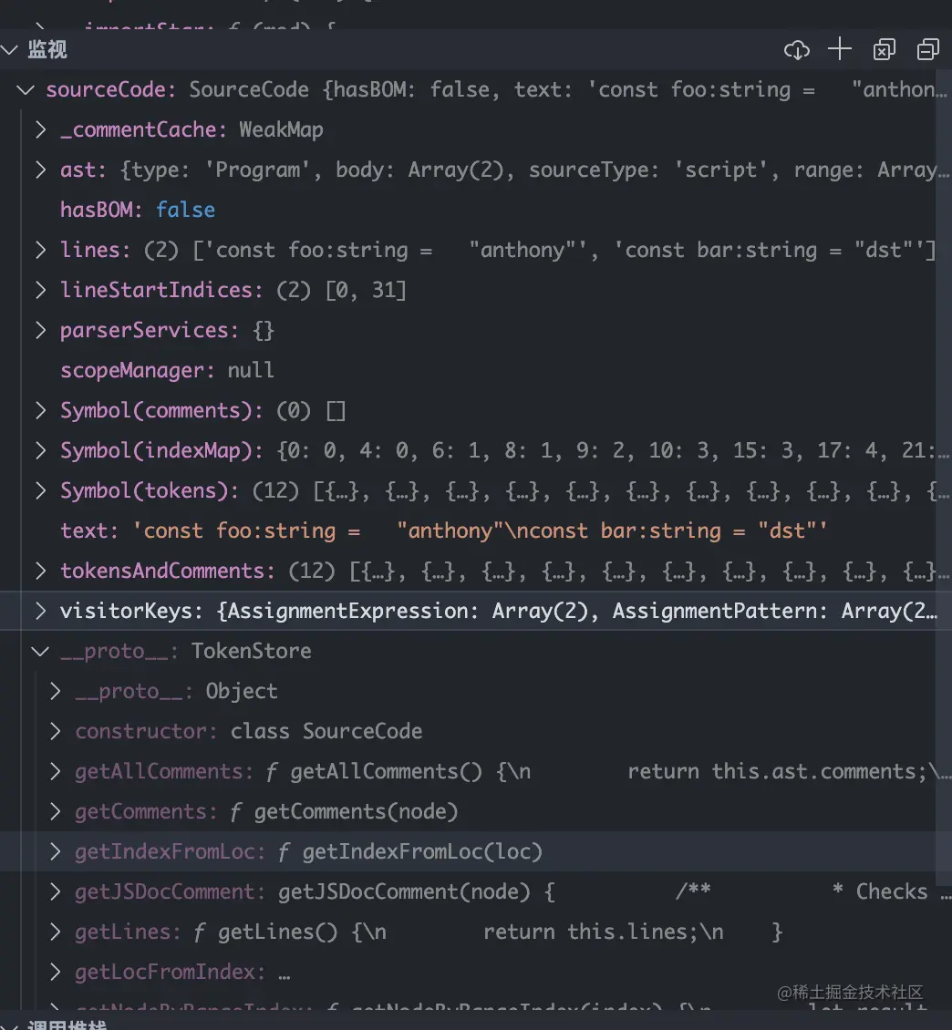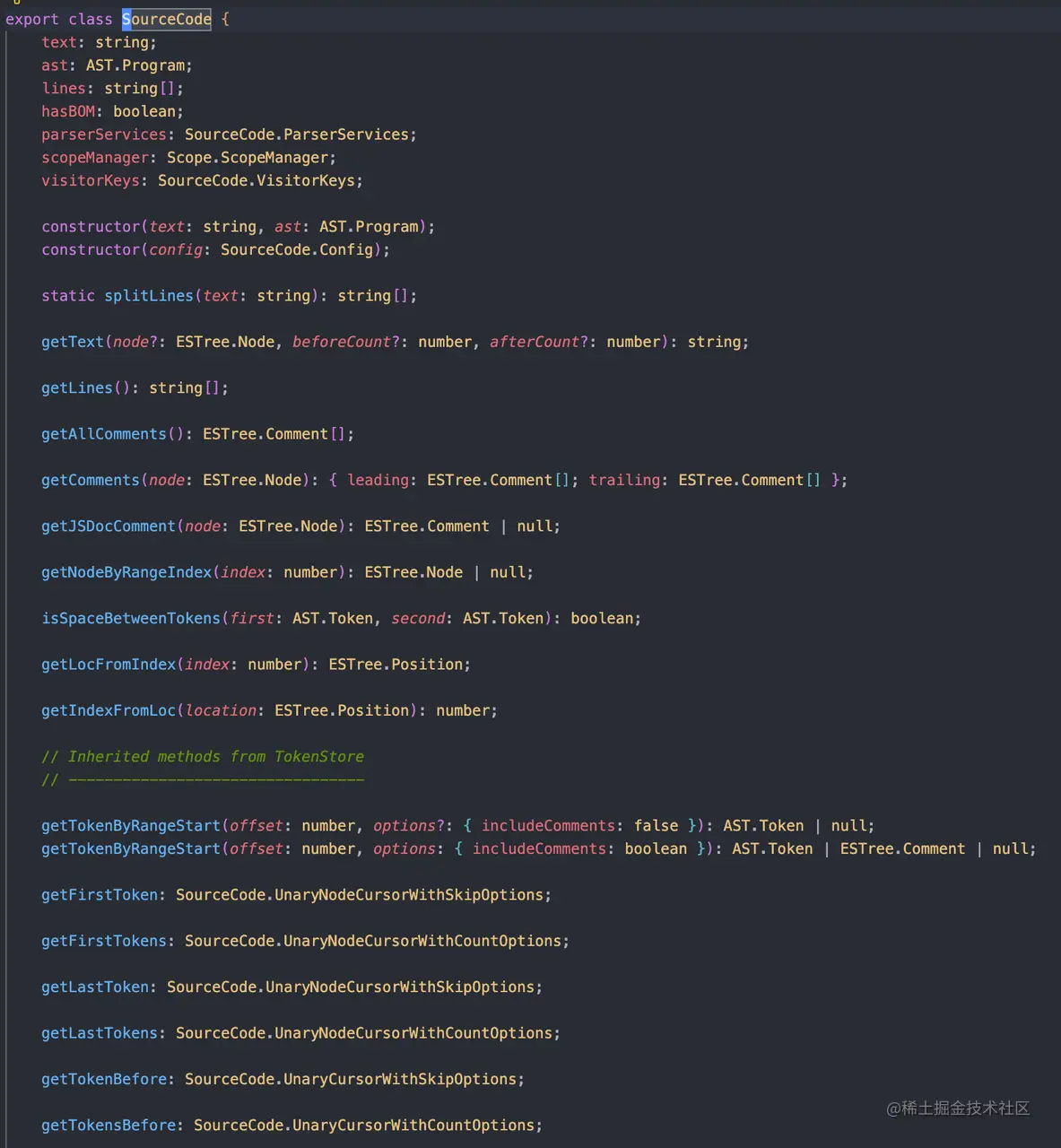 但是根据上面我们可以看到,直接根据 AST 去查找然后比对替换,效率是很低的,而且嵌套比较深。这个时候 ESlint 是怎么干的呢?他生成了一个新的结构用于我们操作,也就是SourceCode。有兴趣进一步探究可以自行查阅源码的 sourcecode/source_code.js部分。简单来说,就是构建了一个 SourceCode 实例,接受两个参数,原文 text 和解析后的 AST,然后返回我们一个包含茫茫多方法的实例对象。