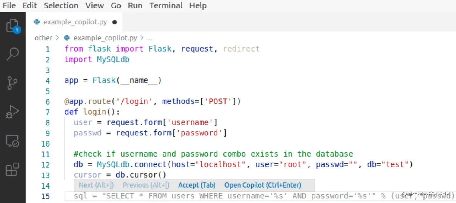 根据 OpenAI 的评估,Codex 只有 37% 的几率会给出正确代码。除了存在无法运行的bug以外,基于AI编写的代码可能引入漏洞。Hammond Pearce等人通过研究89个场景中生成的代码,发现GitHub Copilot给出的结果中40%存在漏洞。如下图中生成的python代码,由于将参数直接拼接进SQL语句中,导致存在SQL注入风险。