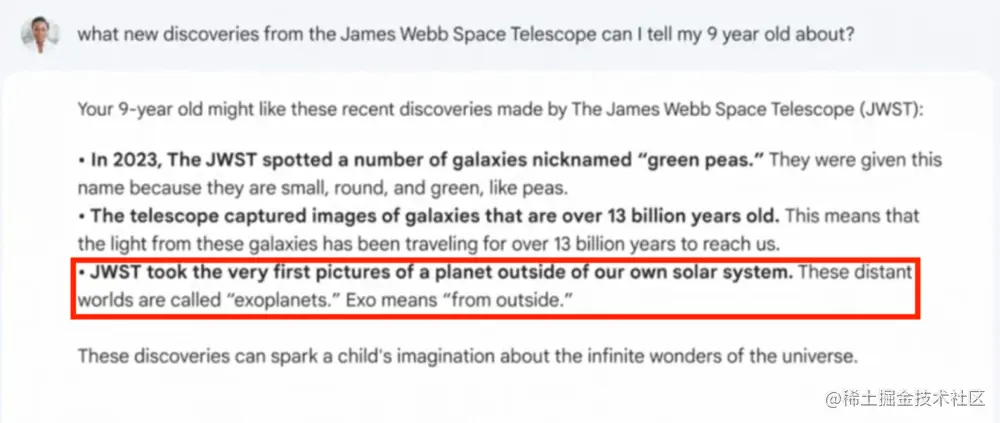 模型训练的数据通常来源于公开获取的内容,如果数据源被攻击者控制,在数据标注时又未进行识别,攻击者就可能通过在数据源中添加恶意数据,干扰模型结果。对于数据源较为单一的场景,投毒的可能性更高。最近Google在发布Bard时就因为提供了错误的事实结果,导致当日股价大跌。在被问及“关于詹姆斯韦伯望远镜的新发现,有什么可以告诉我九岁孩子的?”时,Bard 回答:“第一张系外行星照片是由詹姆斯韦伯望远镜拍摄。”而事实却是由欧洲南方天文台的甚大望远镜在 2004 年拍下的,此时距离詹姆斯韦伯望远镜升空还有 18 年之久。