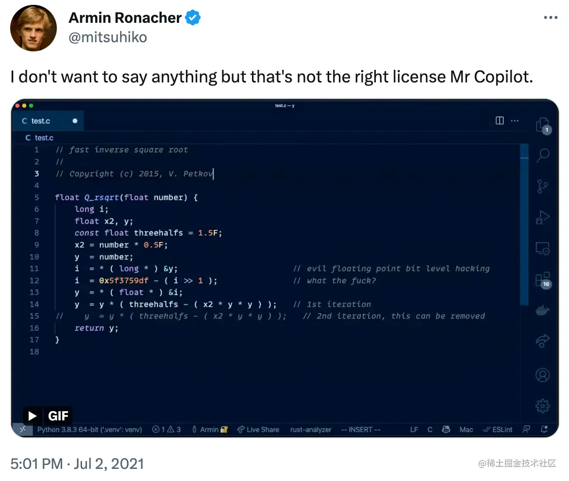 Copilot补全使用了雷神之锤3游戏中快速平方根倒数算法代码