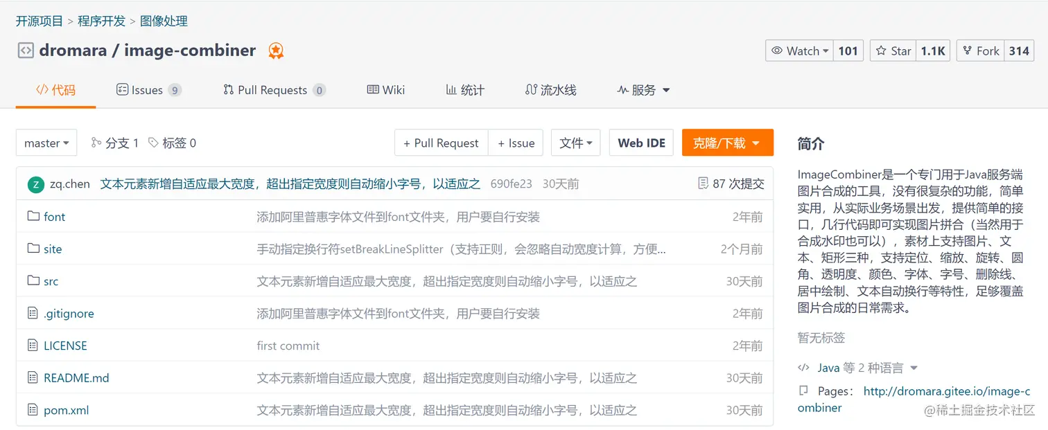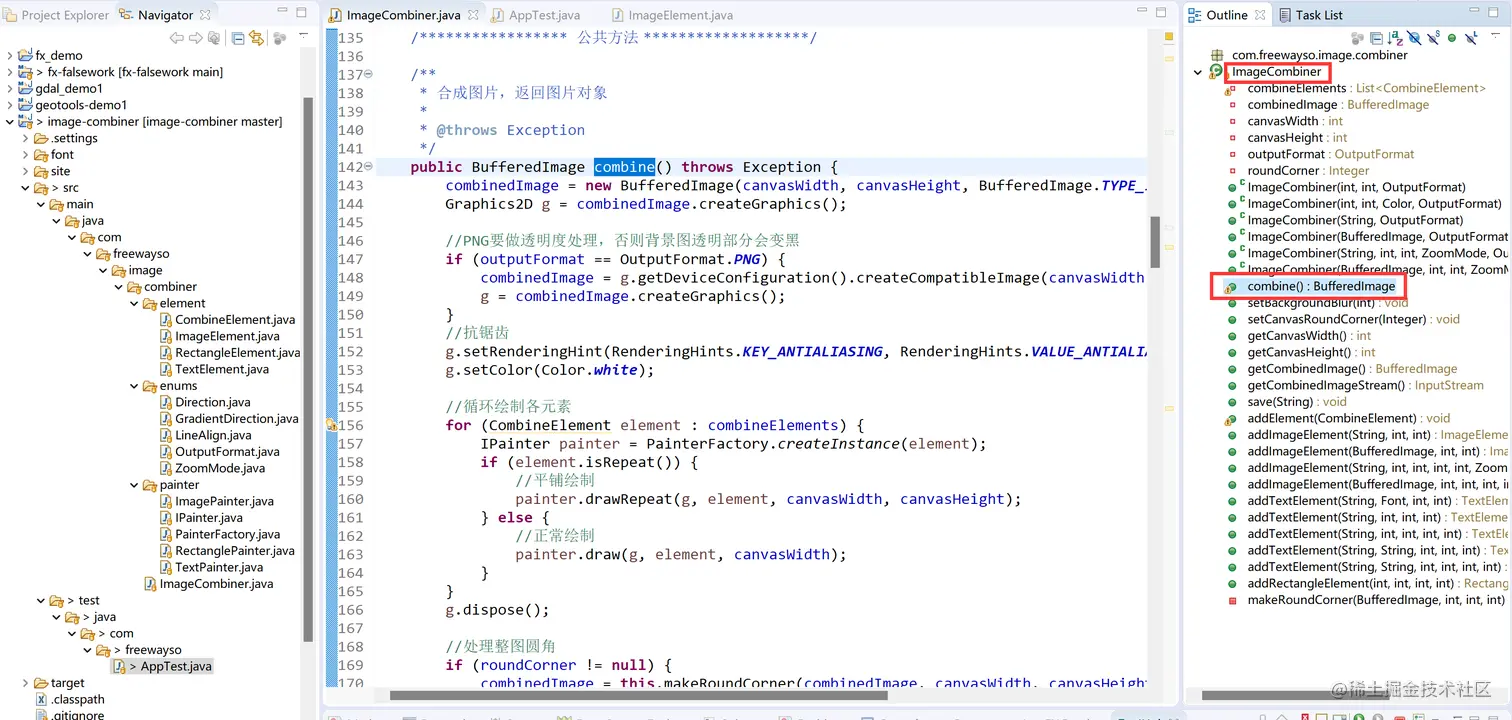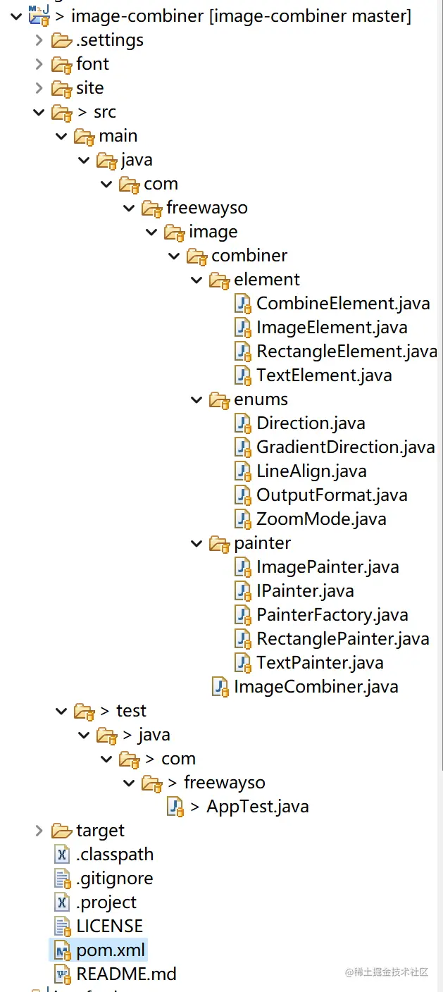 将代码使用git clone下载下来之后,使用开发IDE(这里以eclipse为例)打开。image-combiner的源代码还是比较清爽的,从它的star数就可以看到,受欢迎的程度还是可以的。